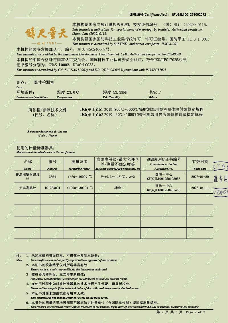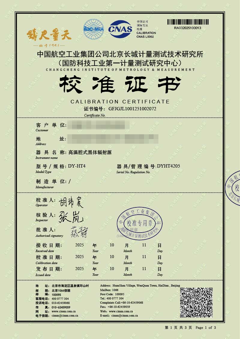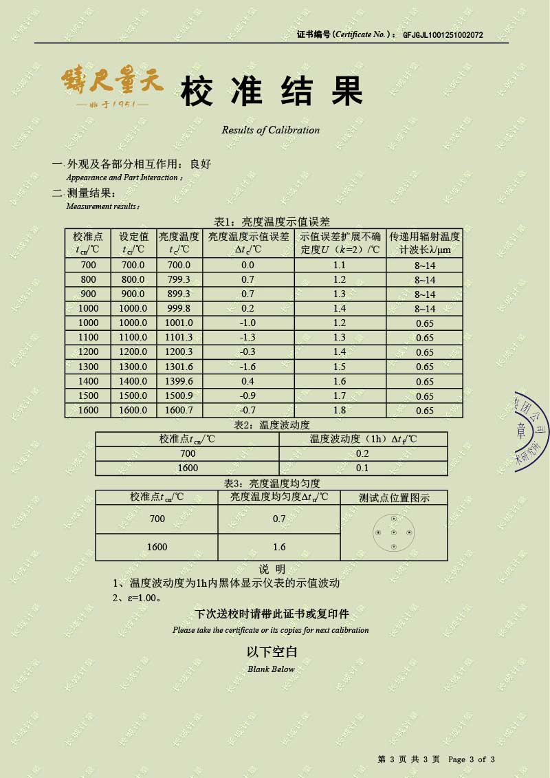 | 上一條:低溫液槽式黑體爐(-40-100℃)校準(zhǔn)證書 | 下一條:智能干體儀(六位半精度)校準(zhǔn)證書 |