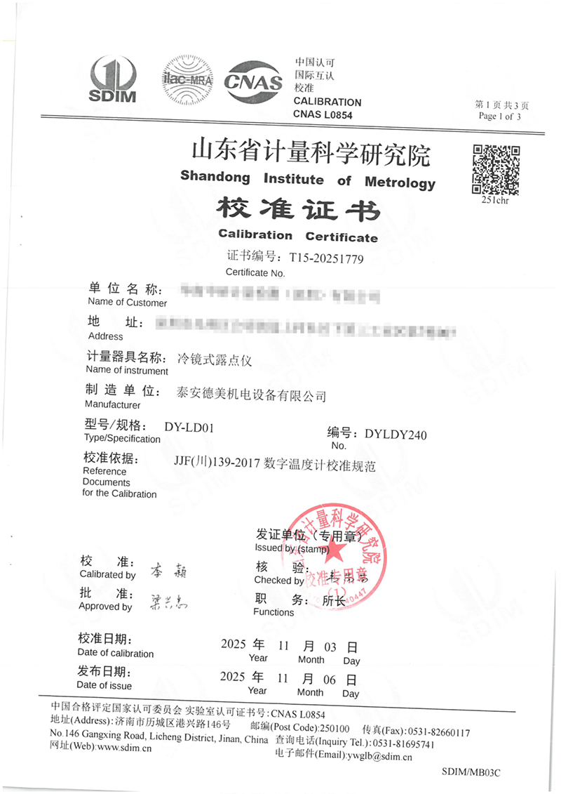 冷鏡式露點(diǎn)儀校準(zhǔn)證書 2025-11-7 本文被閱讀 977 次
