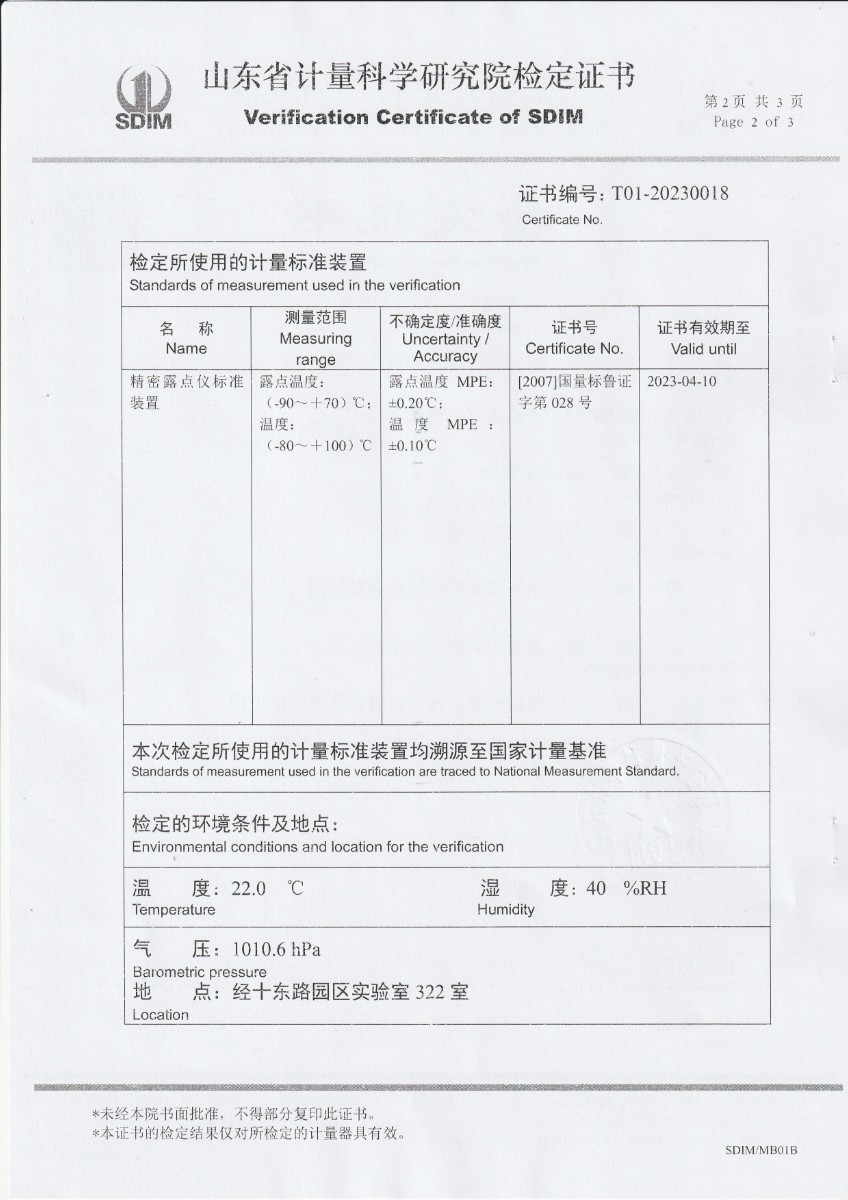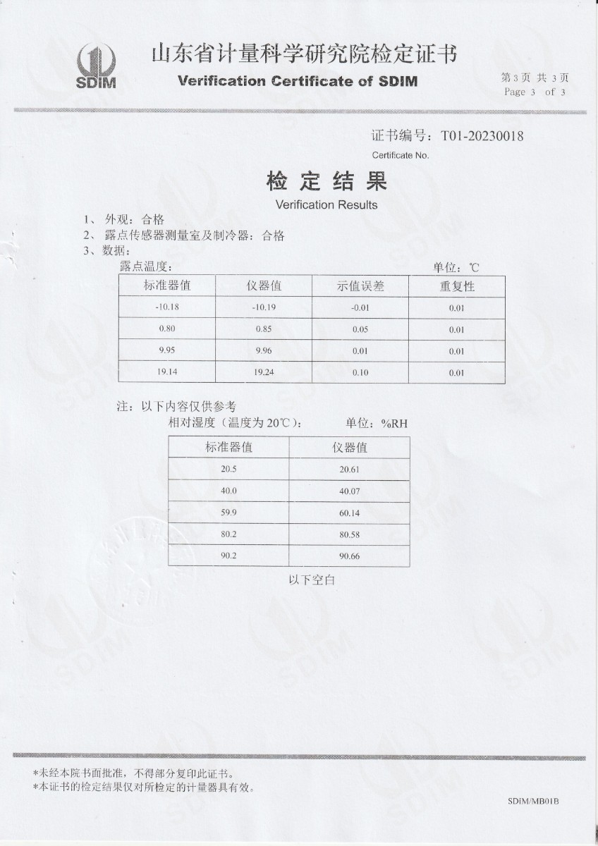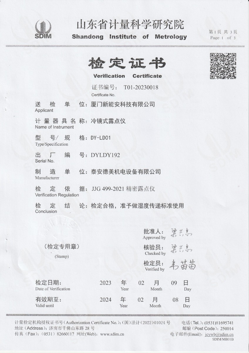 廈門新能安科技有限公司 冷鏡式露點儀 檢定證書 2023-2-25 本文被閱讀 10192 次